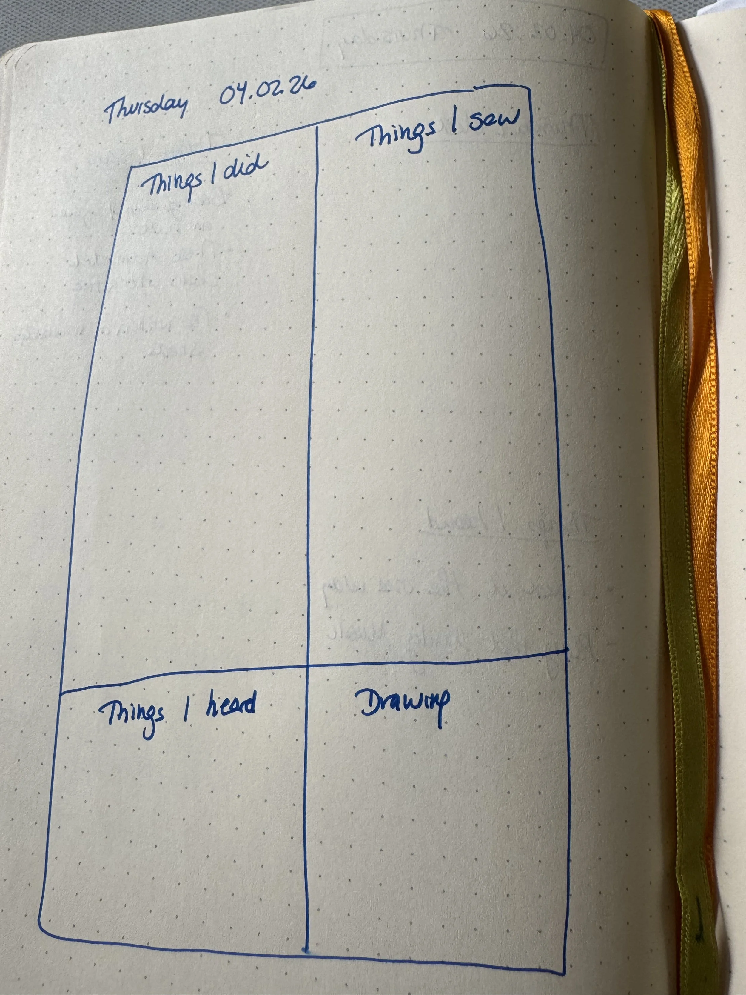 Lynda Barry’s Four Square journaling method consists of drawing a large rectangle in your journal and dividing it into four squares, with the top row being wider than the bottom row.